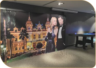 Enhance your fun casino themed party setting with our customised original range of Paparazzi style themed backdrops and an elegant red carpet entry together with gold bollards and red velvet ropes.